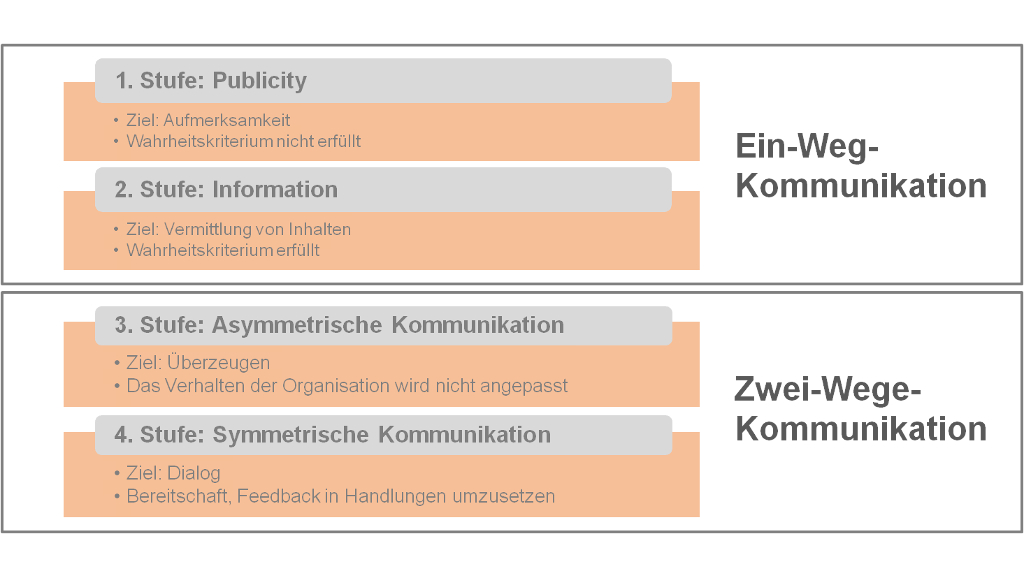 1984 kreierten die Forscher James E. Grunig und Todd Hunt ihr Modell, um PR in verschiedenen Stufen zu beschreiben. Sie sehen in ihrer Definition die PR als organisierte Kommunikation an. Ein Unternehmen kommuniziert in ihrer Definition dabei fortlaufend mit seinen Teilöffentlichkeiten, beispielsweise durch neue Produkte. Jedoch bedarf diese Kommunikation einer Struktur. Diese Aufgabe muss im Sinn von Grunig/Hunt die PR übernehmen.