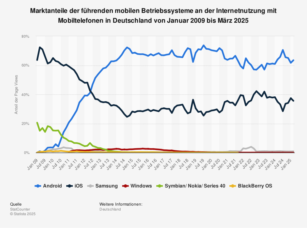 Android ist dabei das meist genutzte Betriebssystem für Smartphones in Deutschland. Von den rund 33,4 Millionen Smartphone-Nutzern in Deutschland nutzen etwa 61 Prozent ein Mobiltelefon mit dem Google Betriebssystem.